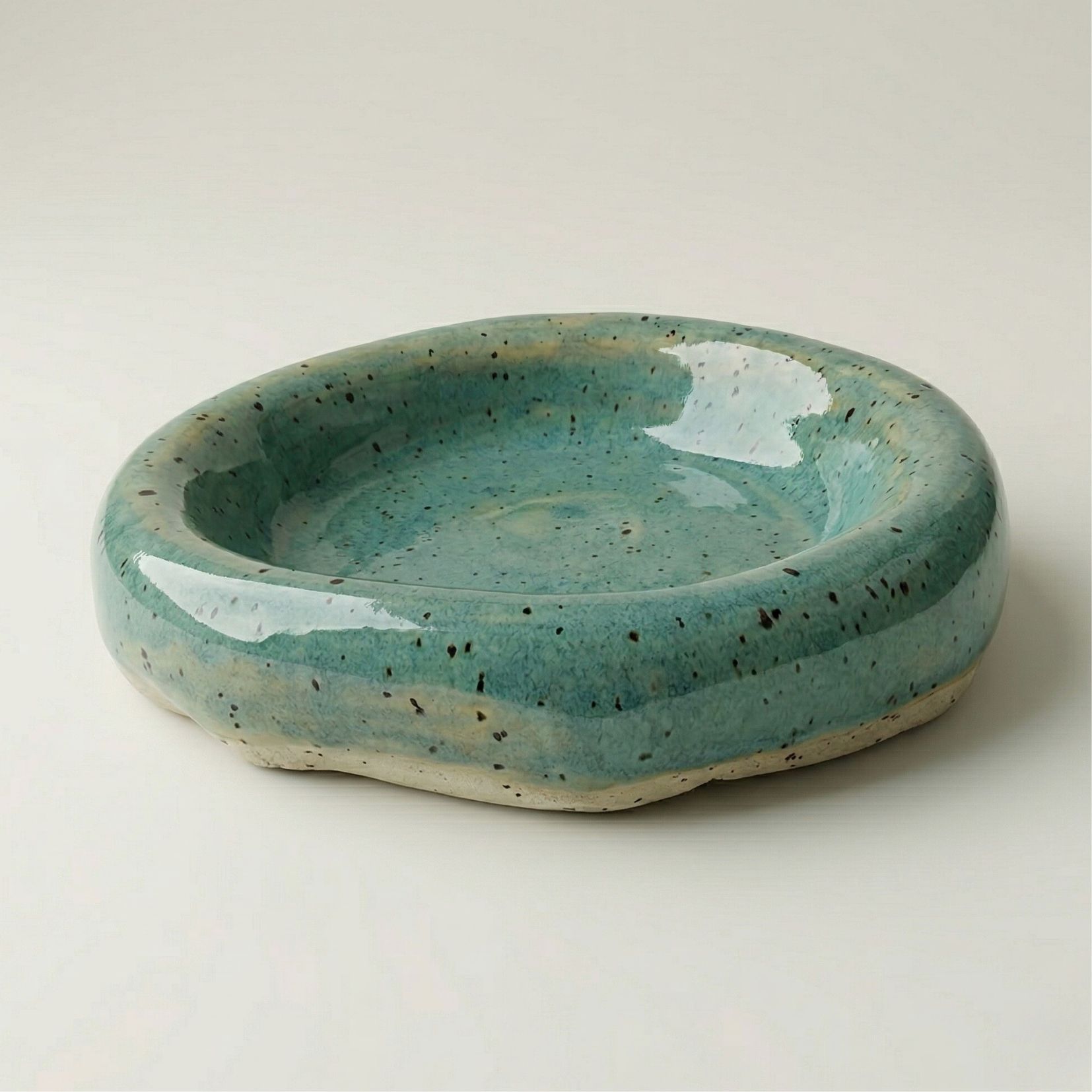 A Fluidez do Esmalte Laguna: O acabamento em esmalte reativo cria uma profundidade visual única. O tom verde-água se acumula nas curvas da peça, gerando variações de cor que mudam conforme a luz do dia, simulando o reflexo do sol em águas calmas.