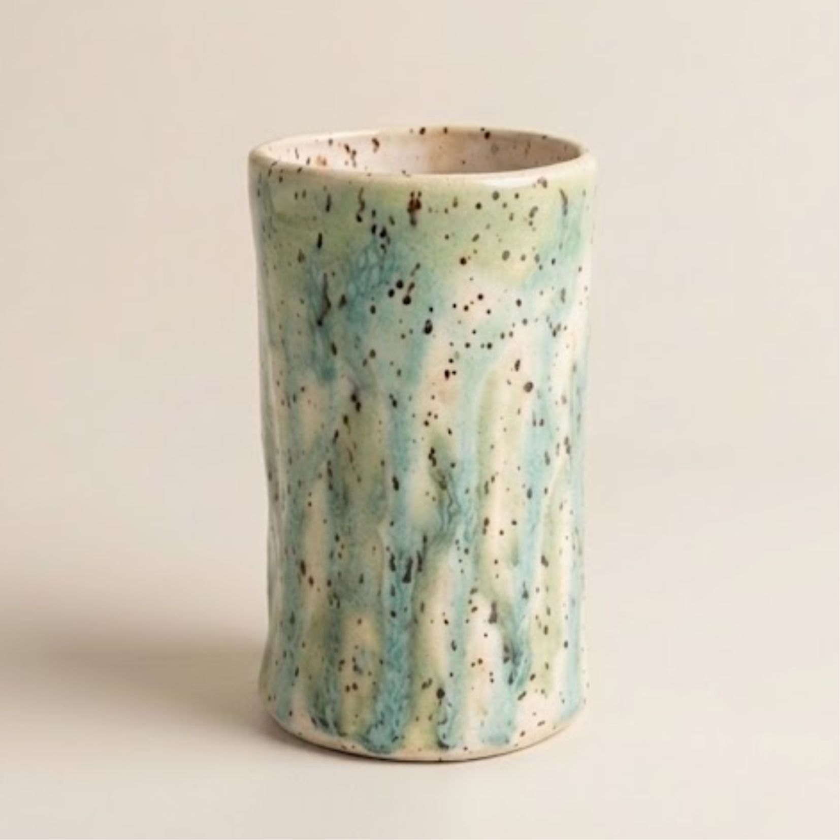 Moldado manualmente, o Correnteza apresenta um esmalte reativo que escorre pelas paredes da peça, criando padrões irreplicáveis de verde-água e areia. É uma peça escultural que se destaca pela sua altura e pela profundidade de suas texturas.